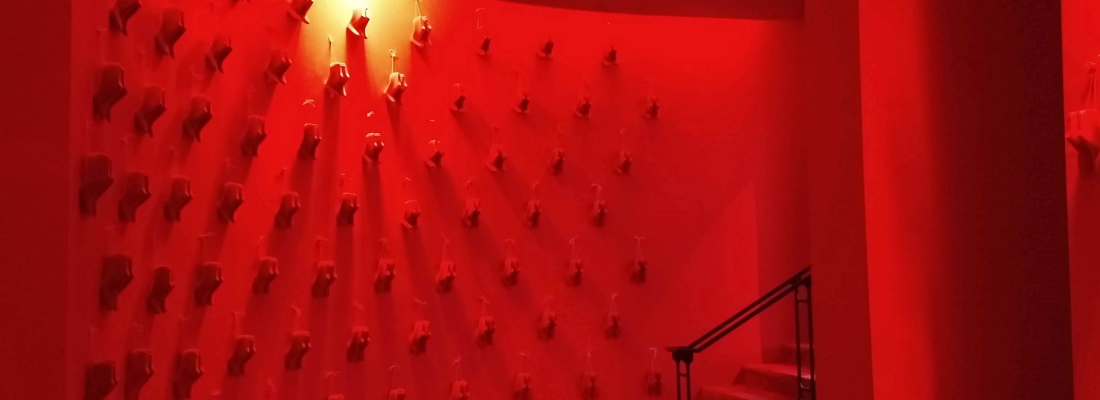 Se trata de una propuesta que deslumbra: hay un hilo irónico que conduce toda la narrativa (como la capilla con vidrieras diseñadas especialmente para esta ocasión, o un paso procesional, casi como los de Sevilla, con un zapato transparente enorme y vestido de blanco en lugar de la virgen…), y todo con un tono de disfrute, seducción y alegría. El color rojo (¡obviamente!) se impone, y la música de diversas películas —las de Federico Fellini entre ellas, en la época en que contaba con Nino Rota—, ilustran los pasos y etapas de creación de los zapatos. Pero además, el mundo de inspiración (diverso, múltiple, fragmentado) de Louboutin está recreado por amigos y artistas de diversas partes del mundo. Los formatos también son sorprendentes, ya que varían de sala en sala, obligando a los visitantes a prestar atención de distintas maneras. Hay un espacio que no tiene desperdicio: la “Granny Room”, que aparentemente es la sala de una abuelita inglesa… pero si miramos “de otra manera”, en profundidad, prestando atención a los detallas, descubrimos otras cosas (¡muy sorprendentes!), tal como explica el vídeo que puede verse en la sala.