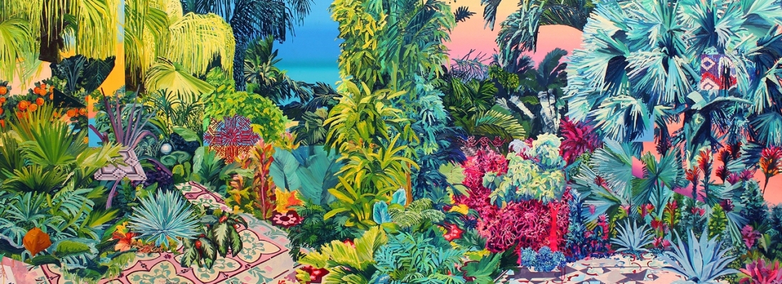 De momento, no suelto la idea del jardín, siento que aún hay mucho que explorar y descubrir aquí. Estoy creando escenas con los elementos vinculados a la naturaleza como las flores y las plantas, e incorporando otros motivos, elementos ornamentales, objetos cotidianos, estampados, jugar con el propio espacio, etc. Esto que me da pie a hablar de temas que me interesan mucho y me están llevando a nuevos campos de experimentación... y también me da la posibilidad de investigar con distintos materiales plásticos, esmalte, sprays, acrílicos flúor, colores muy saturados...
